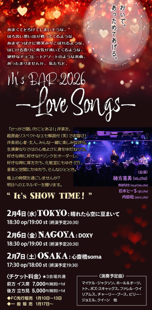 [出演] 緒方恵美(vo,cho)/manzo(vo,pf,ba,cho)/目木とーる(gt,cho)/内田 稔(perc,cho)