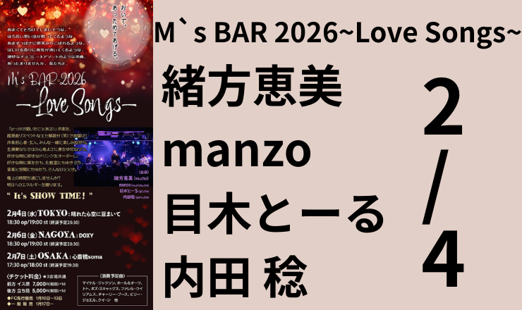 [出演] 緒方恵美(vo,cho)/manzo(vo,pf,ba,cho)/目木とーる(gt,cho)/内田 稔(perc,cho)