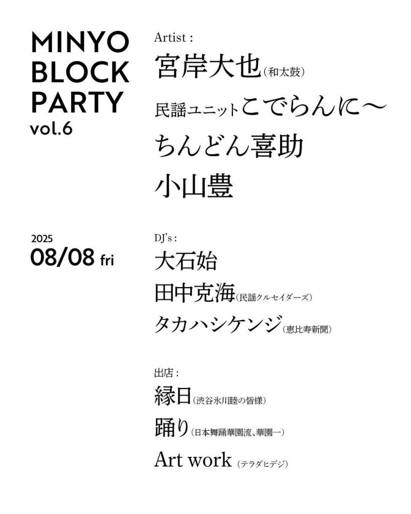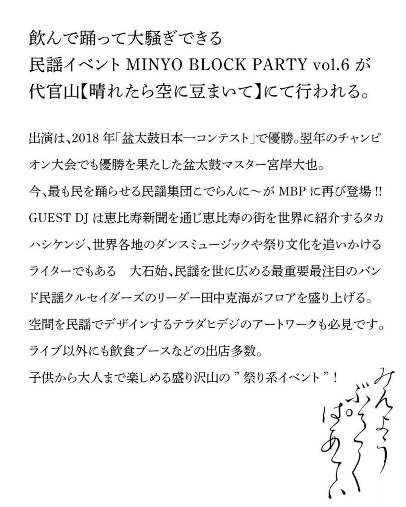 飲んで踊って大騒ぎできる 民謡イベントMINYO BLOCK PARTY vol.6が 代官山【晴れたら空に豆まいて】にて行われる。