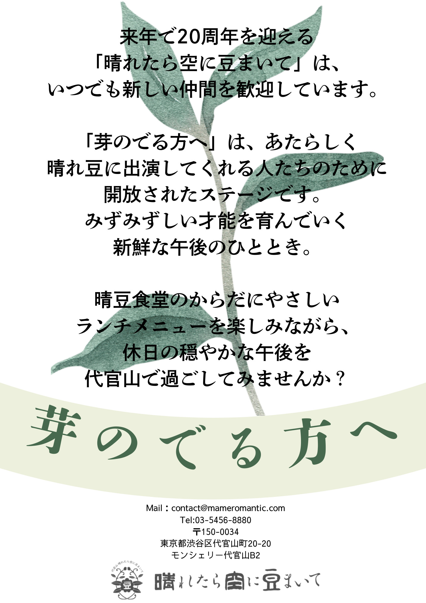 「芽のでるほうへ」は、あたらしく晴れ豆に出演してくれる人たちのために開放されたステージです。