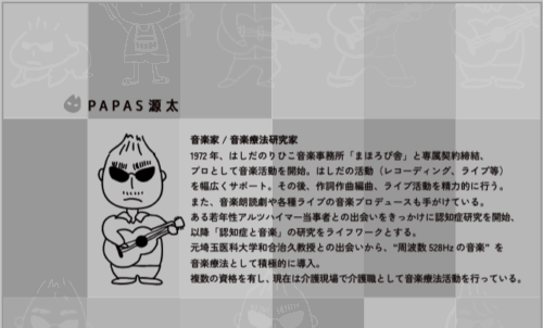 ある若年性アルツハイマー当事者との出会いをきっかけに介護福祉士他複数の資格を修得。現在は介護業務に携わりながら「認知症と音楽」の研究をライフワークとして、音楽療法活動を続けている。