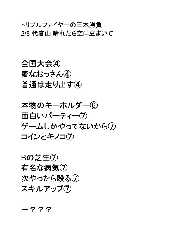 2月8日(日)「トリプルファイヤーの三本勝負」、当日のセットリストを公開しました。