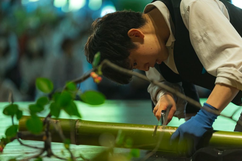 作品を飾るだけでなく、作り上げる過程も見せながら製作するいけばなライブで人々の心に訴えかける。